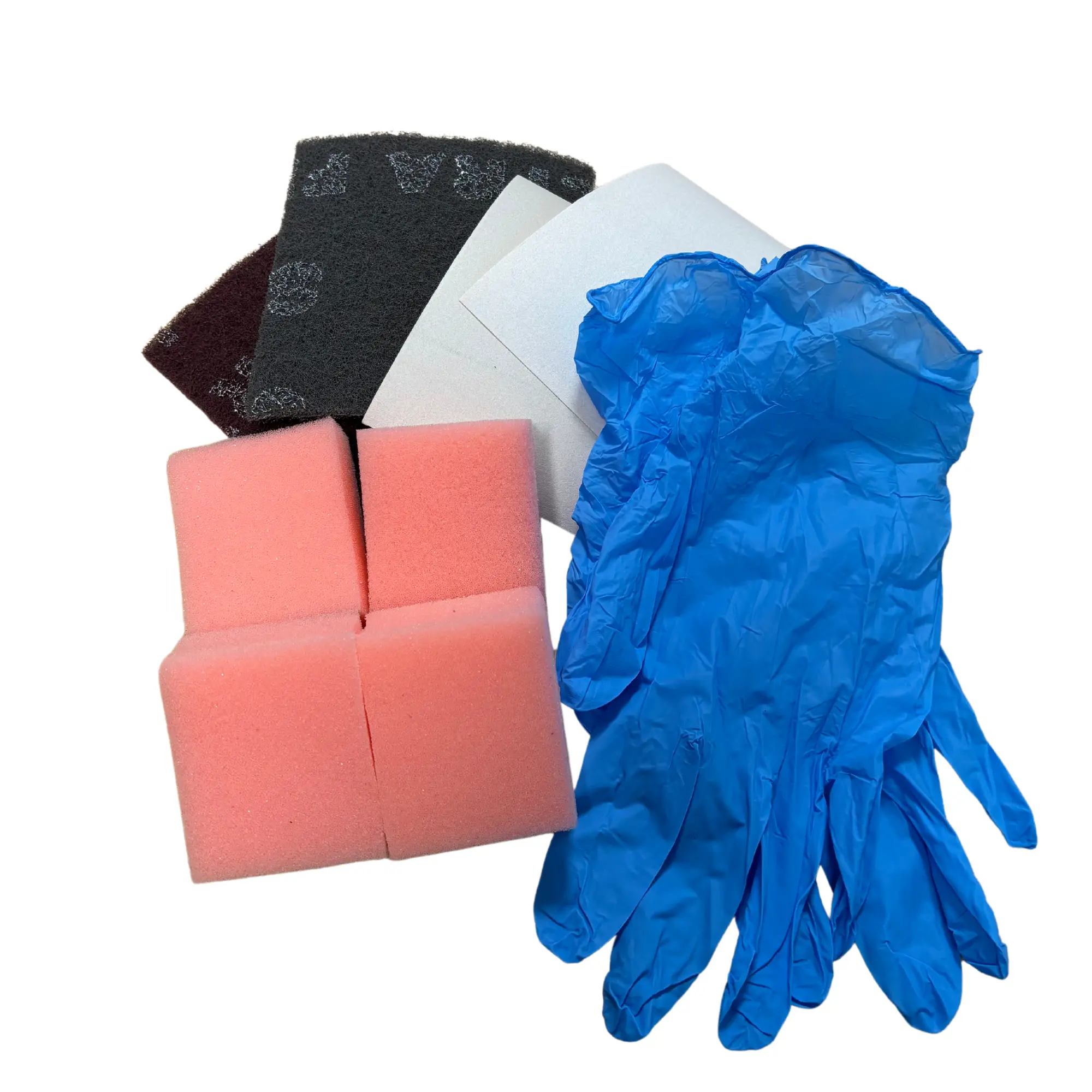 Setul de abrazive include un set de șmirghel și bureți abrazivi (Scotch Brite), care vă vor ajuta să pregătiți mecanic pielea înainte de a trece la restul procesului de renovare. În set veți găsi și tampoane pentru aplicarea vopselei și lacului, precum și mănuși.